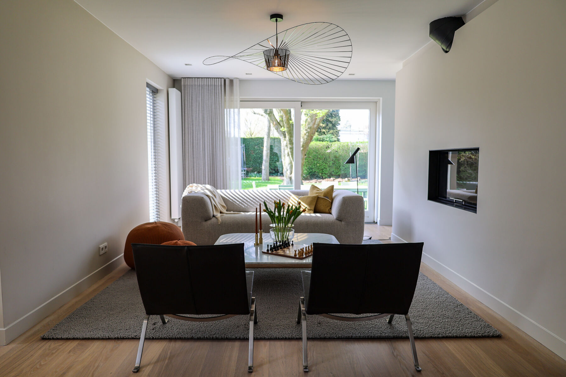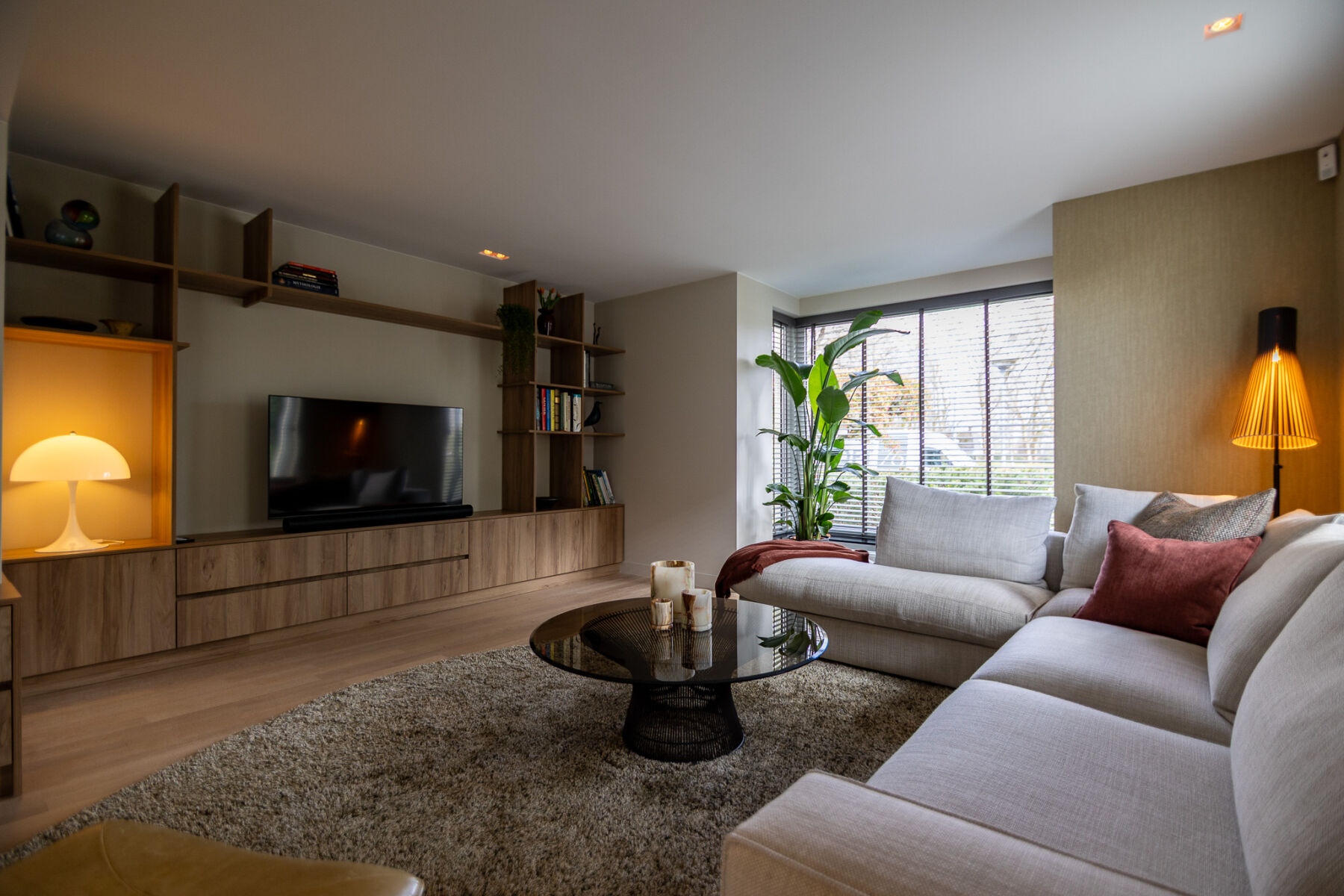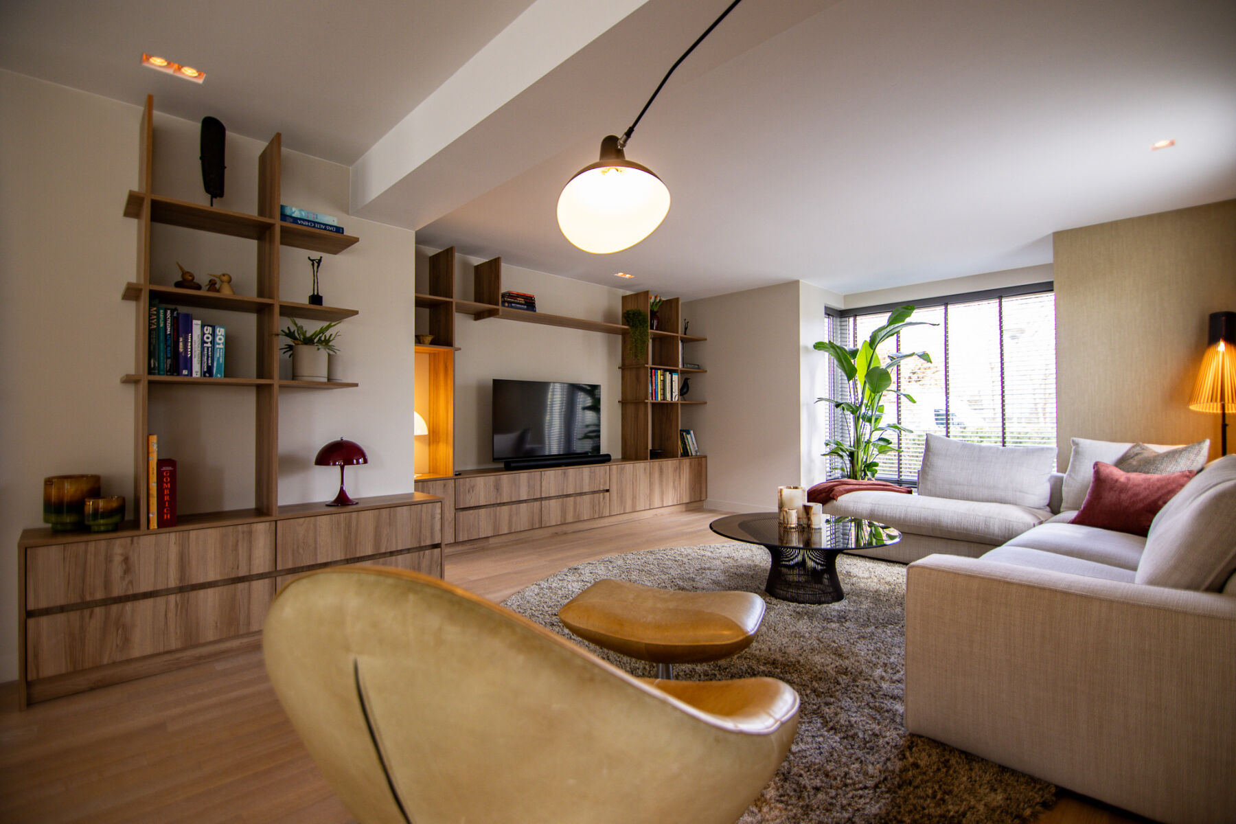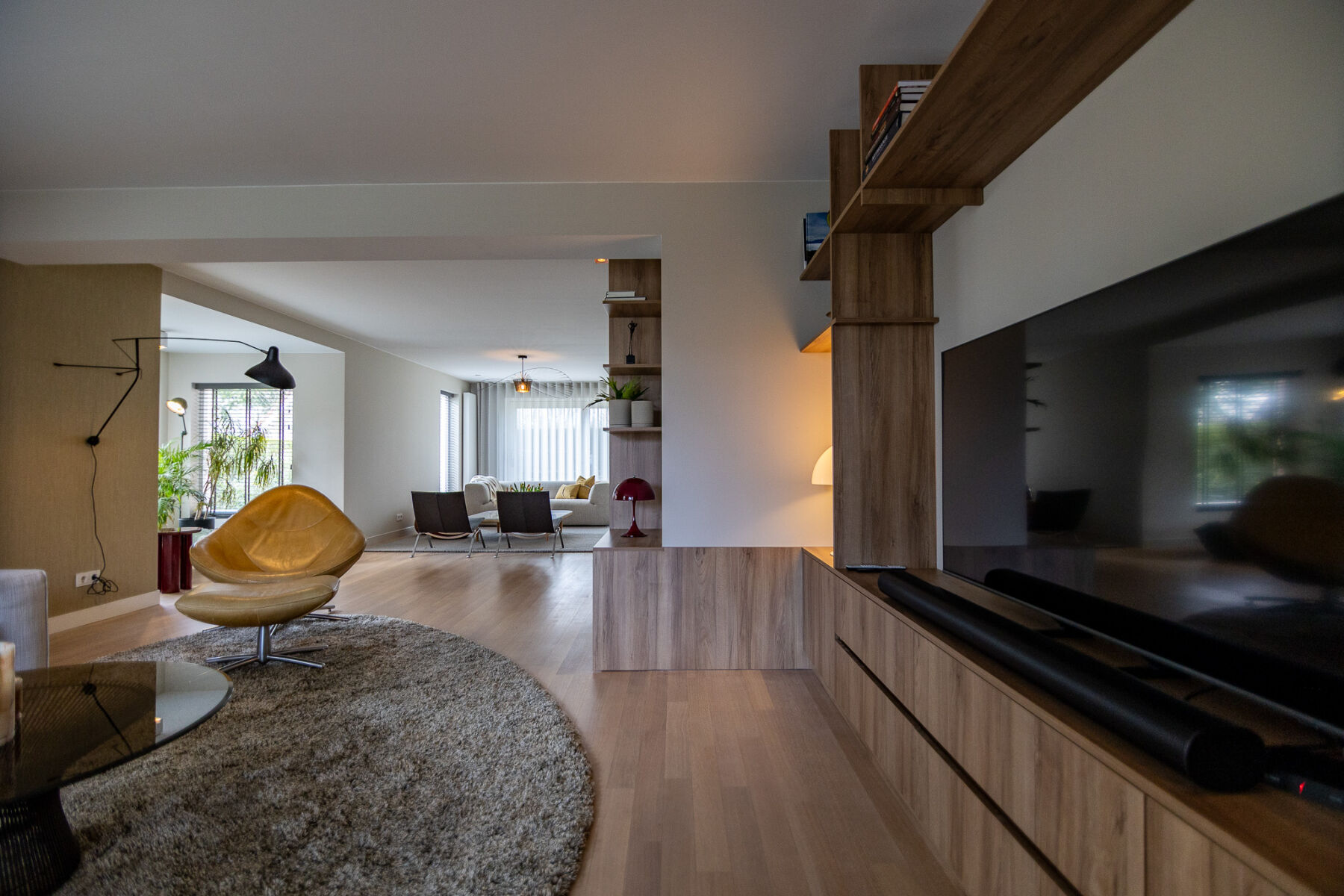 Om de strakke lijnen van de woonkamer te verzachten, hebben wij een organisch vloerkleed toegepast. Dit brengt balans in het geheel en zorgt voor een meer ontspannen en huiselijke sfeer.