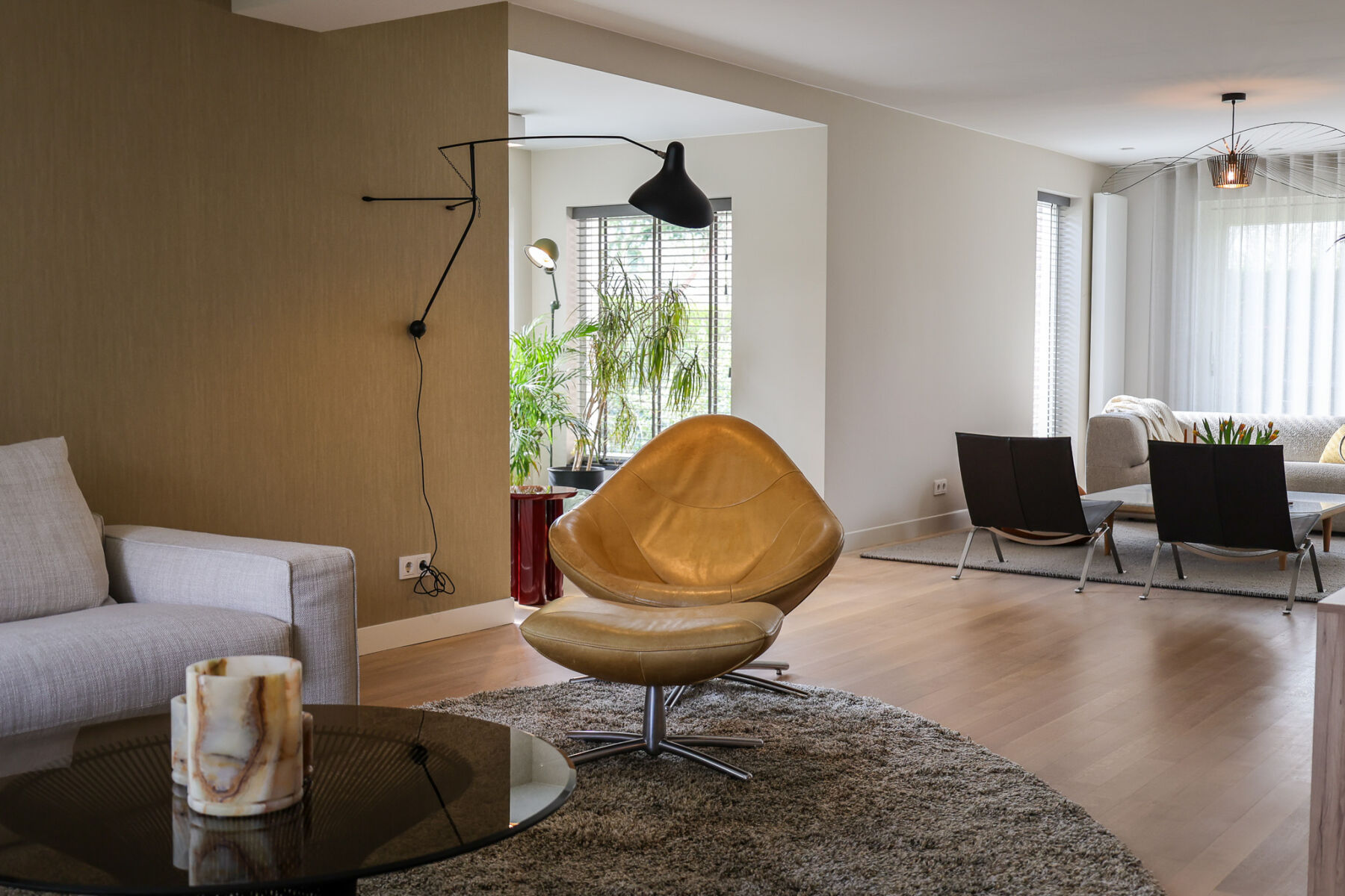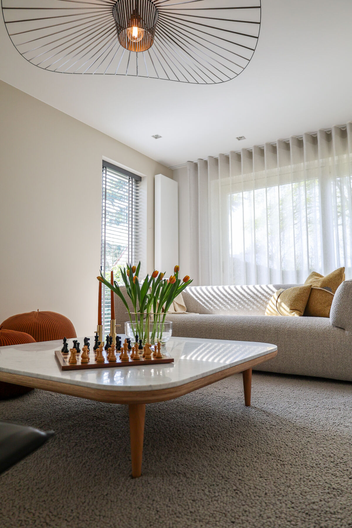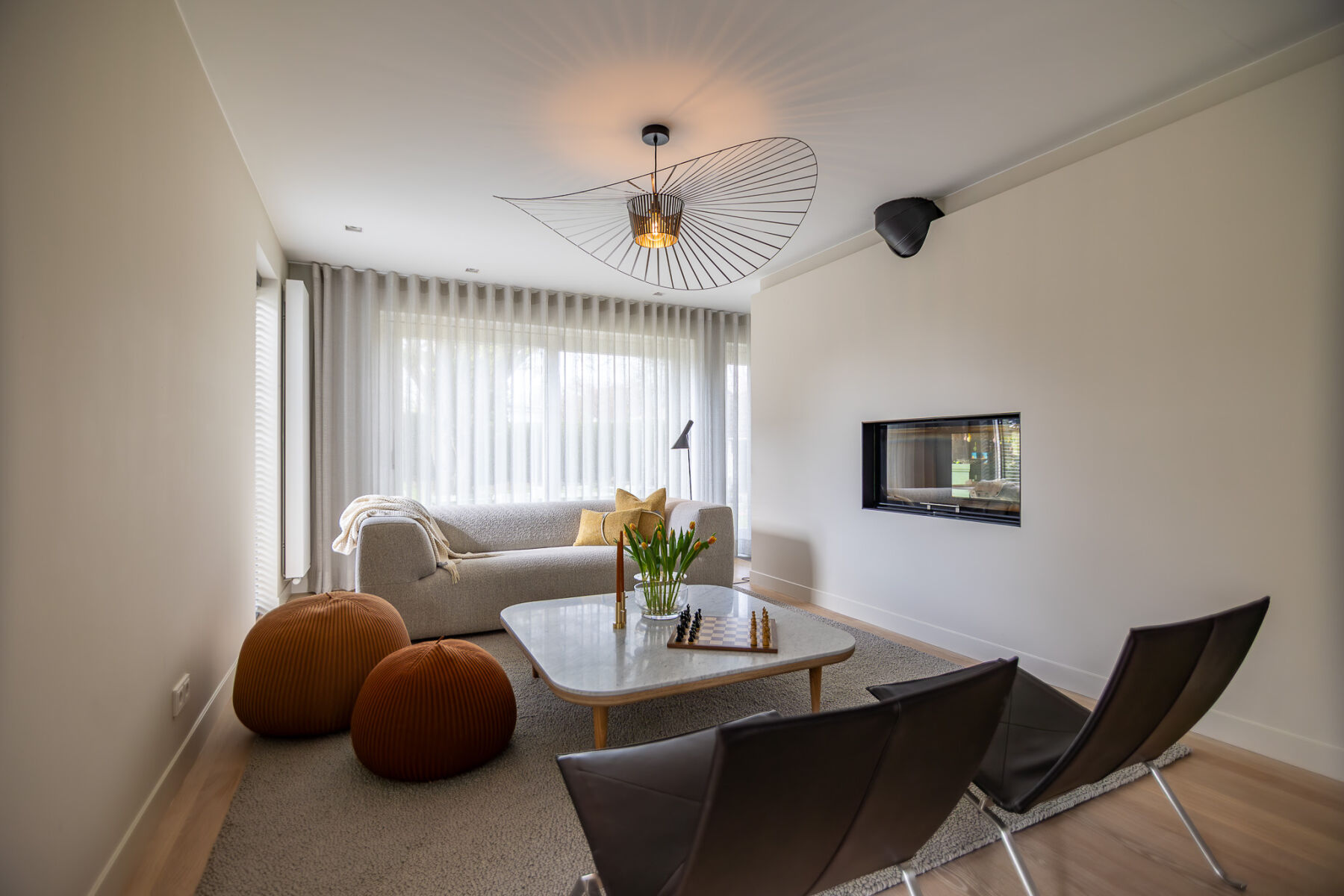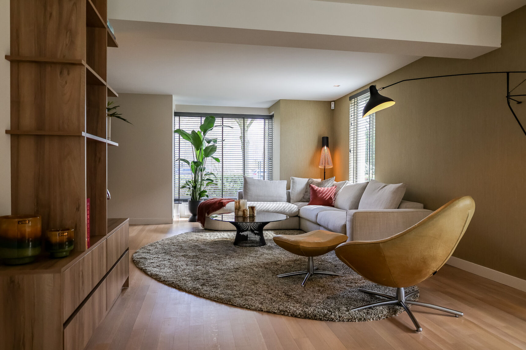Om de strakke lijnen van de woonkamer te verzachten, hebben wij een organisch vloerkleed toegepast. Dit brengt balans in het geheel en zorgt voor een meer ontspannen en huiselijke sfeer.