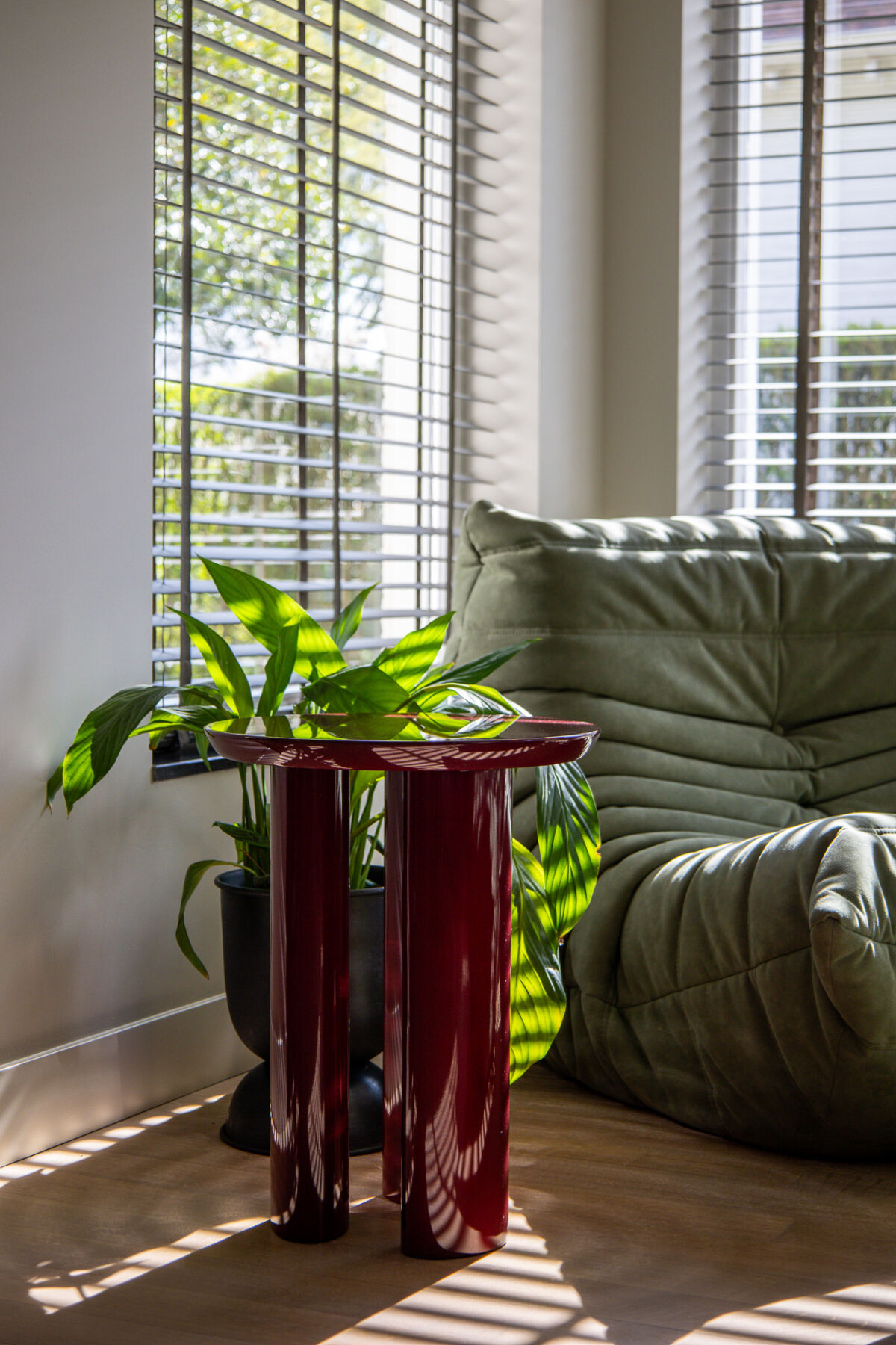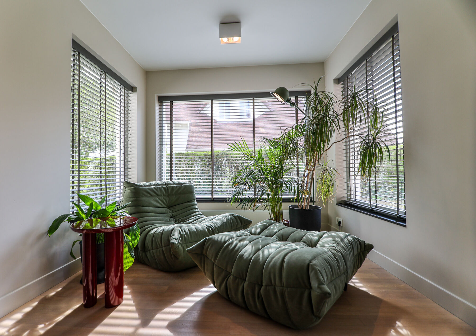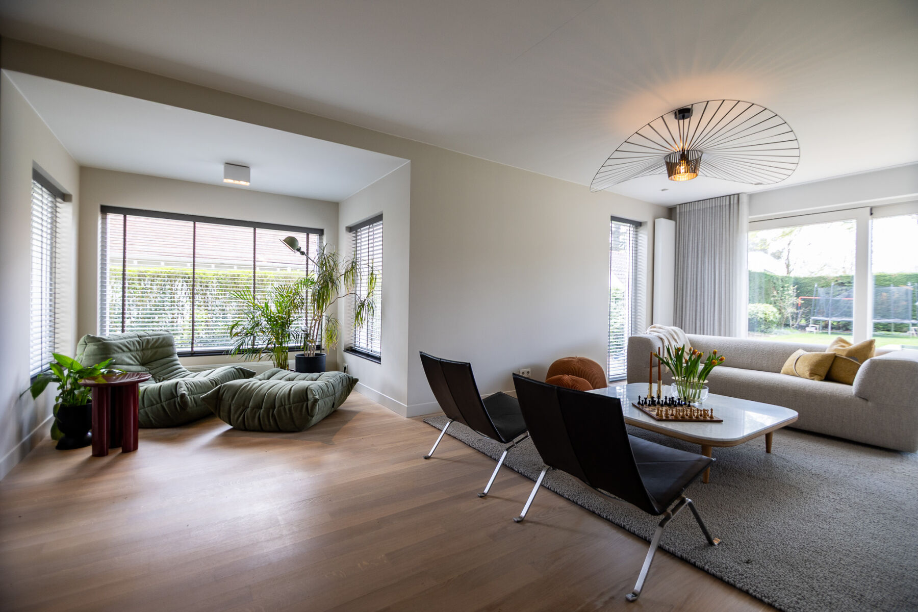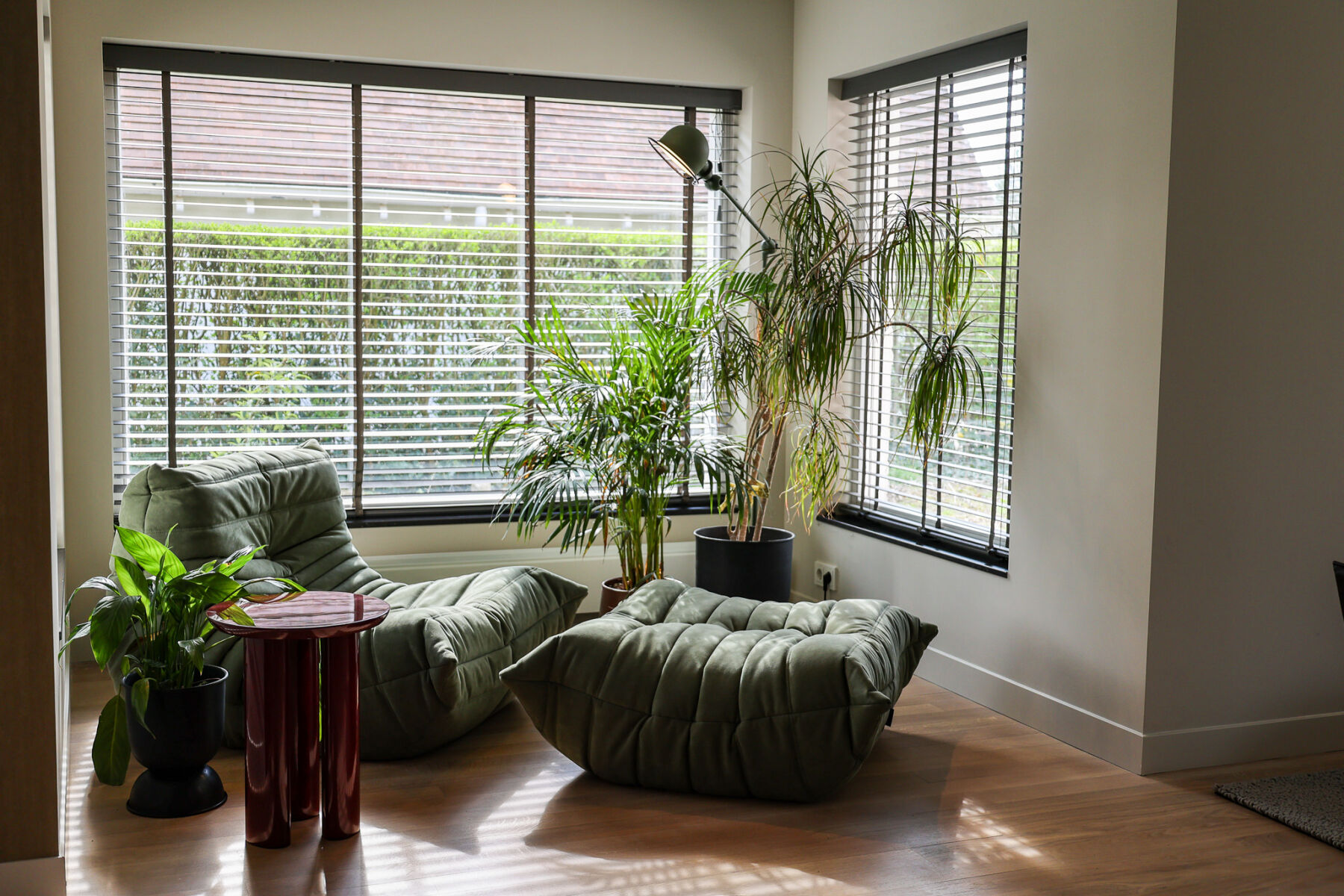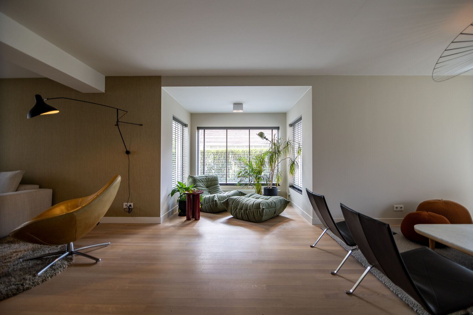 Aan de andere zijde van de ruimte hebben we een tweede zithoek gecreëerd. Een plek die zich moeiteloos leent voor samenzijn, een goed boek of een ontspannen moment. Deze hoek, met uitzicht op de natuur, combineert rustige tinten met speelse accenten en vormt een waardevolle aanvulling op de leefruimte.